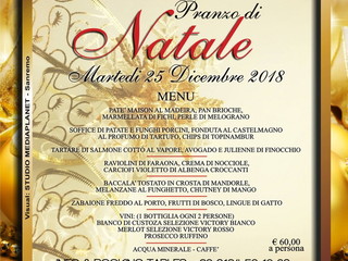 - Martedì 25 dicembre: il Pranzo di Natale con menù degustazione a 60 euro (nelle foto il menù) e l’idea di godersi tanta buona atmosfera natalizia, buon cibo, buon vino... con l’occasione di poter stare con le persone a noi più care, con affaccio sul mare