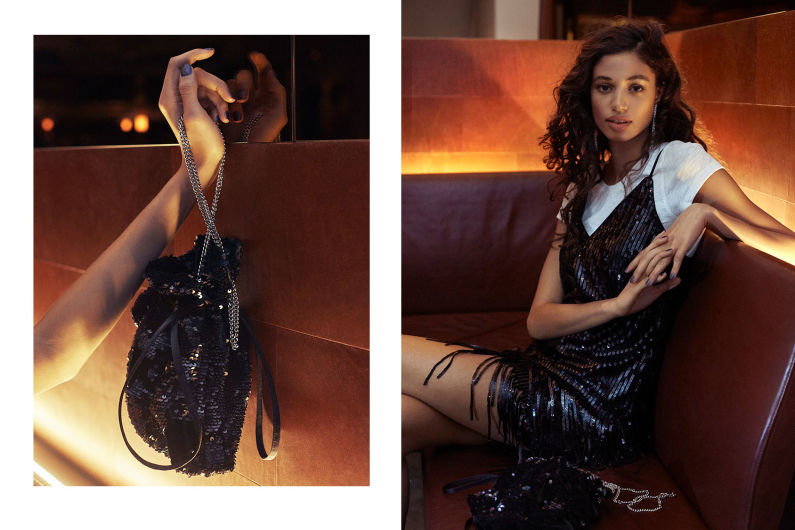 Tornando al classico, un vestito corto nero con paillettes è un po 'troppo per la cenone del 31 dicembre? Potrete indossarlo con una semplice maglietta bianca, portando gli elementi essenziali della festa in una borsa a marsupio coordinata.