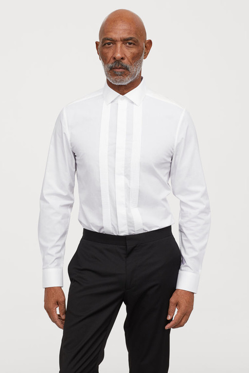 Indossando sotto la giacca una camicia in tessuto di cotone, con il colletto cut-away, sparato rinforzato con plissettature e abbottonatura alla francese, maniche lunghe e polsino regolabile con bottoni. Slim fit per una linea aderente con punto vita marcato e spalle strette per una silhouette attillata.
