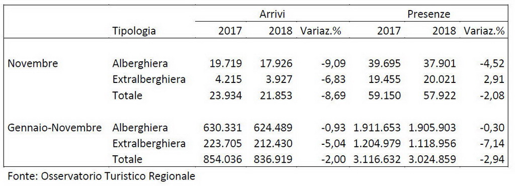 Dai dati si evince che nel mese di novembre gli arrivi nelle strutture alberghiere sono diminuiti del 9,09% e in quelle extralberghiere del 6,83%; le giornate di presenza hanno subìto un ridimensionamento solo nelle strutture alberghiere, -4,52%, mentre sono cresciute in quelle extralberghiere, +2,91%. Dall’analisi del periodo nel suo complesso, nelle strutture alberghiere gli arrivi hanno registrato una diminuzione dello 0,93% e le presenze dello 0,30%, in quelle extralberghiere i clienti si sono ridotti del 5,04% e le giornate di presenza del 7,14%.