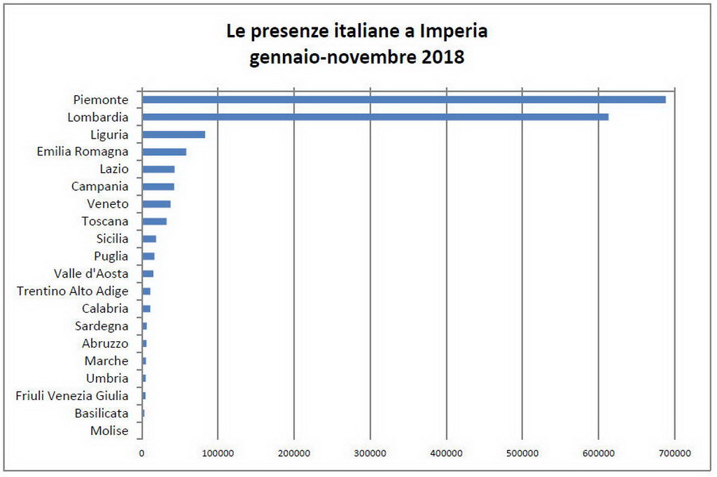 Nell’estremo ponente (indice di rispondenza pari al 95,79%) gli arrivi sono stati 21.853 (-8,69%), di cui 12.768 italiani (-1,82%) e 9.085 stranieri (-16,87%). Le giornate di presenza sono state 57.922, di cui 37.943 riconducibili agli italiani (+5,97%) e 19.979 agli stranieri (-14,41%). Nei primi 11 mesi del 2018 gli arrivi sono diminuiti del 2,00% (-4,18% gli italiani, +0,41% gli stranieri) e le presenze del 2,94% (-5,11% gli italiani, +0,01% gli stranieri).