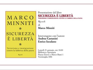 Terrorismo e immigrazione: contro la fabbrica della paura. Questo il sottotitolo del libero ‘Sicurezza è libertà’ che l’ex Ministro dell’Interno Marco Minniti presenterà a Ventimiglia lunedì prossimo, 21 gennaio, alle 18 presso la Biblioteca Aprosiana.