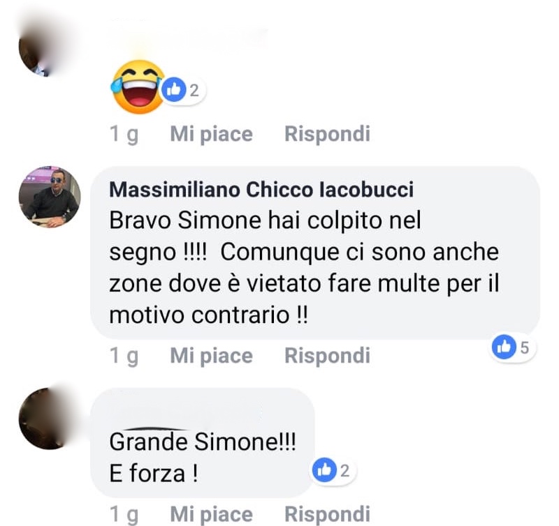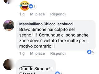 “Bravo Simone, hai colpito nel segno - scrive Iacobucci che poi aggiunge - comunque ci sono anche zone dove è vietato farle per il motivo contrario”. Se da una parte, quindi, Baggioli sosteneva che la Polizia Municipale multasse chi appoggia il candidato sindaco Sergio Tommasini, dall’altra Iacobucci afferma che a Sanremo ci sono zone dove non vengono elevate sanzioni a chi sta dalla parte dell’attuale amministrazione.