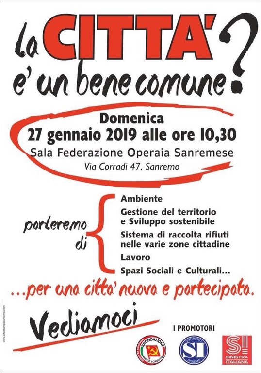 Domenica mattina alle 10.30 nella sala della Federazione Operaia Sanremese in via Corradi 47 ci sarà una pubblica assemblea organizzata da Rifondazione Comunista, Sanremo Insieme e Sinistra Italiana.