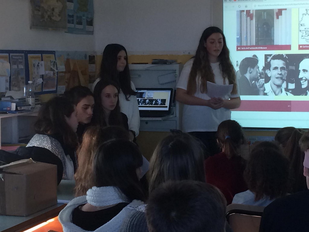 "I ragazzi hanno potuto assistere alla presentazione della mostra 'La rosa bianca', dedicata all'impresa di alcuni studenti tedeschi che tentarono di contrastare la violenza del regime nazista diffondendo volantini inneggianti alla pace, all'uguaglianza e alla libertà e pagando con la vita il loro coraggio. La mostra è stata presentata da alcuni ragazzi della 4Z del liceo Cassini, che con passione e semplicità hanno spiegato la vicenda agli allievi delle medie".