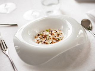 Oltre alla carta rinnovata, troviamo 3 proposte di menù (da euro 35 a euro 90) dove poter scegliere ed assaporare per esempio i gamberi di Sanremo con crema di carciofi e terra di nocciola, i plin di fagioli di Pigna con acciughe del Cantabrico, la côtes de veau con bietole, pomodori secchi e olive taggiasche. Sapori, profumi e colori che sposano alcuni prodotti del presidio slow food coinvolgendo i piccoli produttori e valorizzando le piccole produzioni di eccellenza. ll menu del ristorante varia, inoltre, in base alla stagionalità e viene spesso aggiornato e rivisitato con i prodotti freschi del mese ed il pescato del giorno.