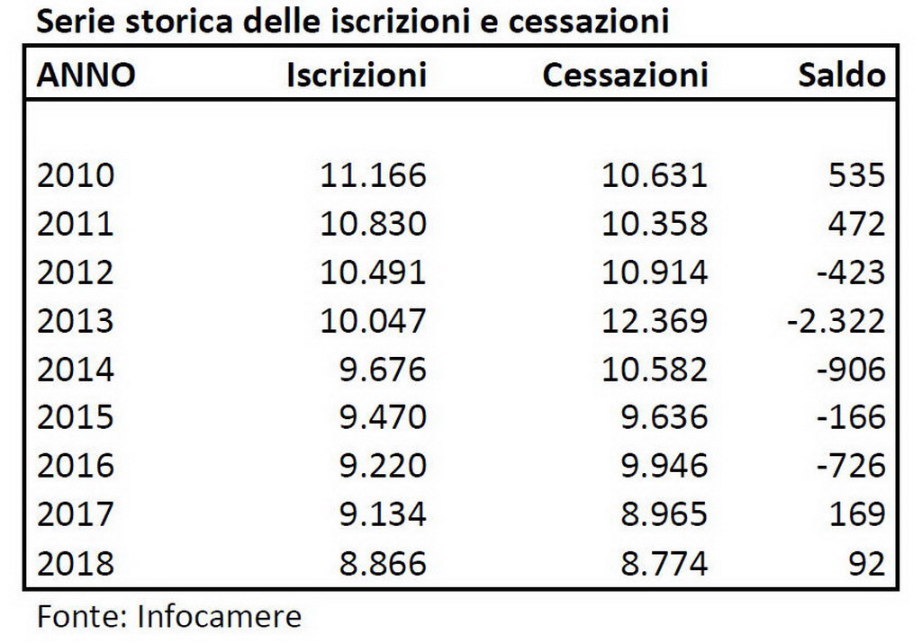 Ancora negativo il bilancio delle imprese artigiane, con una perdita di 430 imprese e un ulteriore peggioramento rispetto al 2017, quando le chiuse con una perdita di 370 unità.