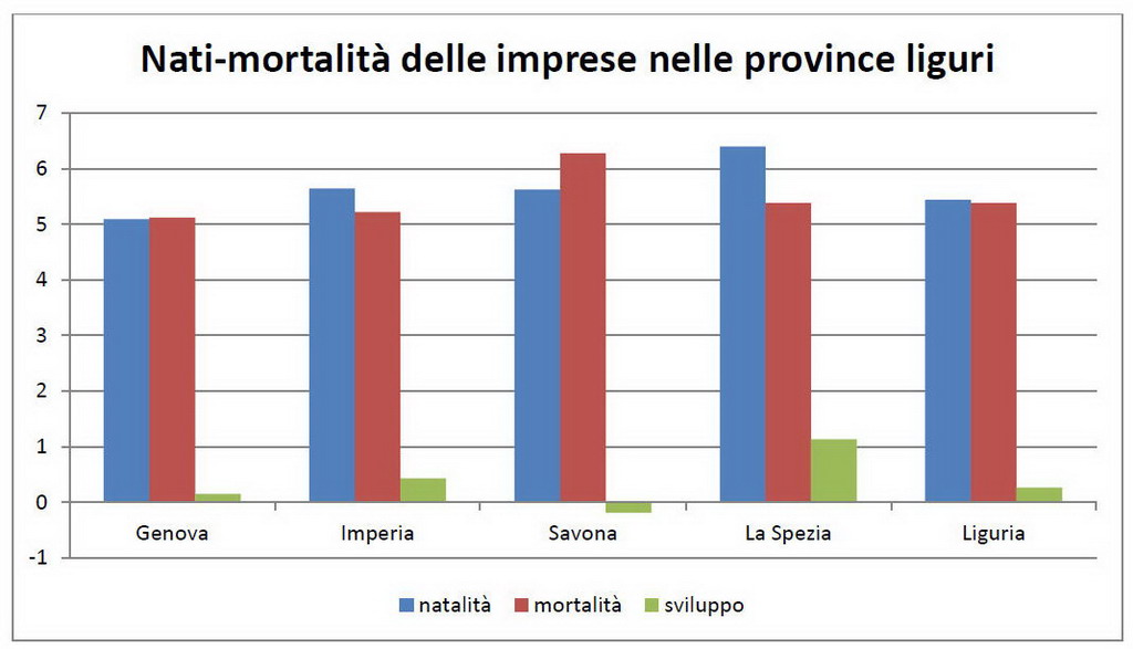 A livello provinciale è La Spezia a “crescere” di più (tasso di sviluppo pari all’1,13%), con 1.332 iscrizioni a fronte di 1.120 cessazioni e con un saldo positivo pari a 212 imprese. Segue Imperia con 1.457 aperture e 1.348 chiusure (saldo pari a +109 imprese e tasso di crescita allo 0,43%). Dietro la nostra provincia ci sono Genova e Savona. Il capoluogo ha fatto segnare 4.376 iscrizioni e 4.406 cessazioni chiude il 2018 con una perdita di 30 imprese ma un tasso di sviluppo ancora positivo (+0,15%). Savona registra 1.701 aperture e 1.900 chiusure, con un saldo negativo pari a 199 unità e un tasso di crescita del -0,19%.