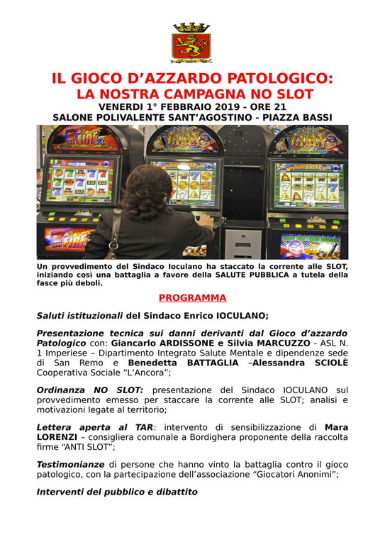 Ad aprire i lavori il Sindaco Ioculano, che presenterà il provvedimento emesso per staccare la corrente alle SLOT con analisi e motivazioni legate al territorio. Si continuerà con un’illustrazione tecnica sui danni derivanti dal Gioco d’azzardo Patologico a cura di Giancarlo Ardissone e Silvia Marcuzzo (ASL N. 1 Imperiese) Dipartimento Integrato Salute Mentale e dipendenze sede di Sanremo e Benedetta Battaglia, Alessandra Sciolè Cooperativa Sociale “L’Ancora”, si passerà all’intervento di sensibilizzazione “Lettera aperta al TAR” di Mara Lorenzi, consigliera comunale a Bordighera proponente della raccolta firme “anti slot” e si arricchirà delle testimonianze di persone che hanno vinto la battaglia contro il gioco patologico, con la partecipazione dell’associazione “Giocatori Anonimi”.