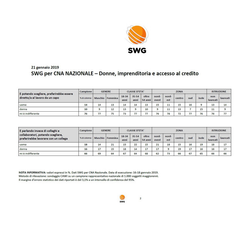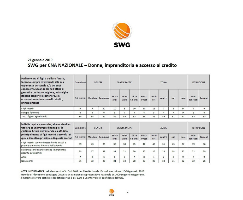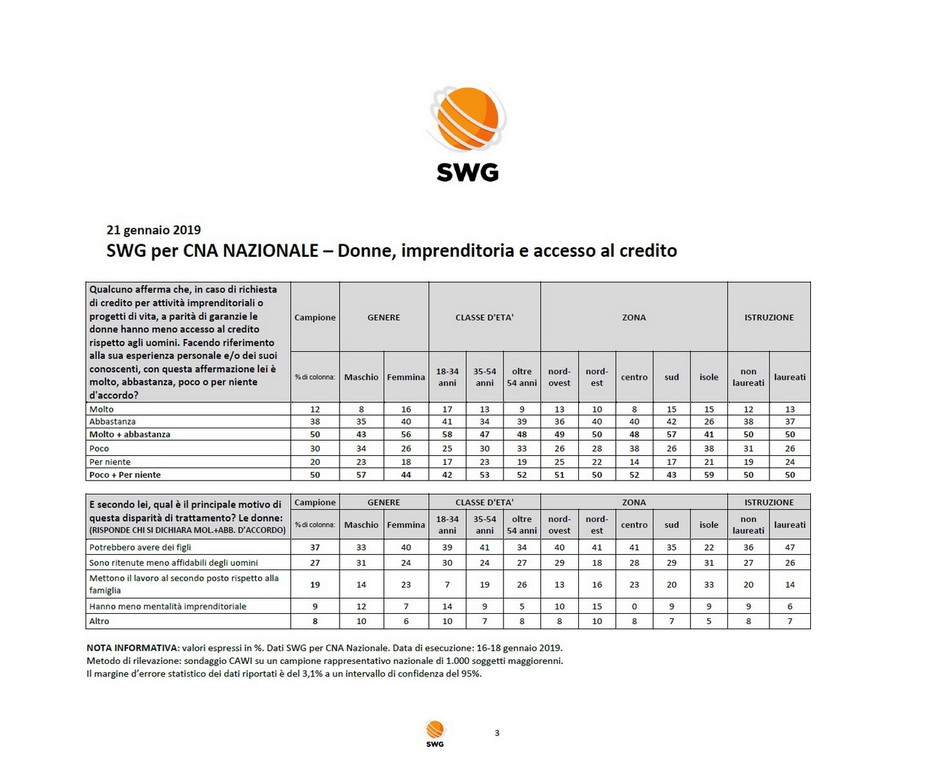 Nelle immagini in basso, l’indagine "Donne: imprenditoria e accesso al credito" di SWG per CNA Nazionale