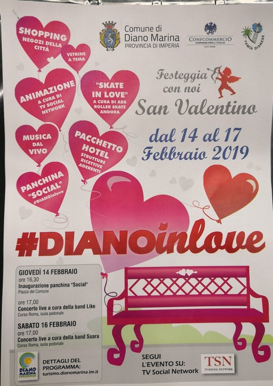 In occasione di San Valentino, la festa degli innamorati, il comune di Diano Marina in collaborazione con la Confcommercio del Golfo Dianese, l'Associazione Famia Dianese, gli esercizi commerciali e le strutture ricettive dianesi, propongono una serie di iniziative dal 14 al 17 febbraio 2019 racchiuse nell’evento #DIANOinlove.