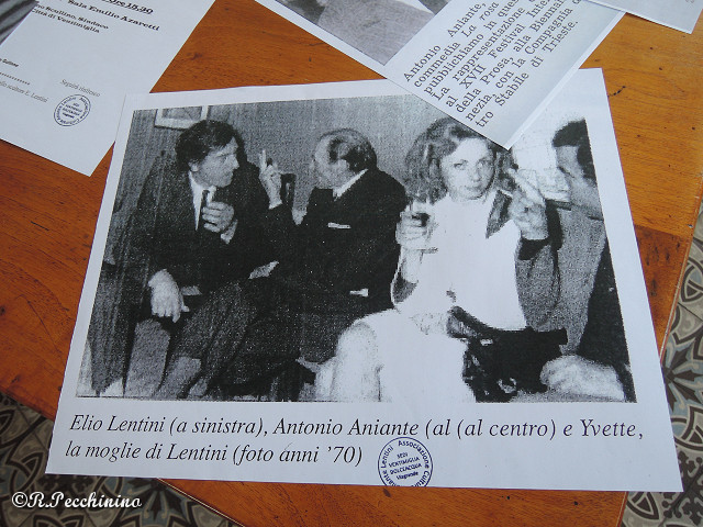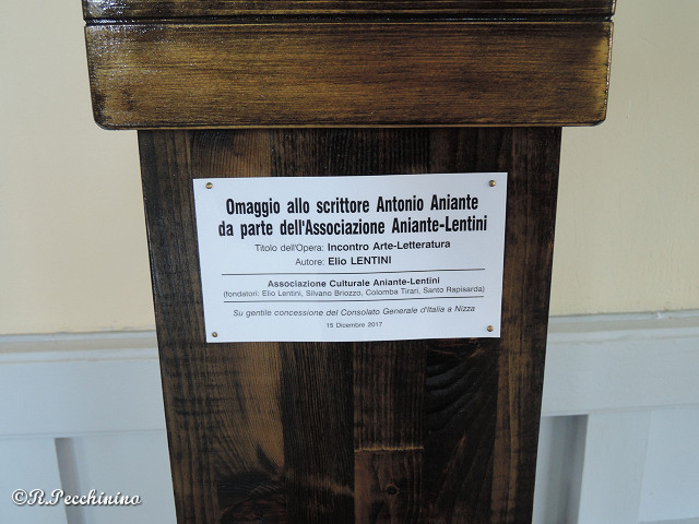 Presso la sede del Consolato Generale d'Italia a Nizza, si è svolto a fine gennaio, un'incontro organizzato dal Console Generale Cav.Uff. Raffaele De Benedictis, a seguito della manifestazione “Arte e Letteratura” organizzata il dicembre 2017, dove il maestro Elio Lentini (Presidente dell'Associazione Aniante – Lentini), aveva in occasione al vernissage della mostra, donato una sua opera, che raffigura l'incontro tra lo scrittore e critico d'arte Antonio Aniante. Nella sala del Consolato Generale dove è esposta l'opera, molte erano le persone italiane e Italo-Francesi, presenti all'incontro per commemorare la figura dello Scrittore, Critico d'Arte e Drammaturgo Antonio Aniante. Il Console Generale De Benedictis, ha ringraziato il maestro Lentini, per la sua cordiale e apprezzatissima disponibilità, a mantenere viva l'arte e la cultura Italiana, con mostre e opere nel Palazzo del Consolato Generale d'Italia a Nizza. Presenti all'incontro S.E. Cristiano Gallo (Ambasciatore d'Italia nel Principato di Monaco), Leonardo Saviano (Storico del Principato di Monaco), Prof. PierLuigi Megassini (Dir.Accademia Belle Arti-Sanremo), avv. Silvano Briozzo (moderatore), Dott. Claudio Pozzani (Dir. Museo Poesia di Genova), Cav.Uff. Antonio Brunetti (medaglia d'Oro V.T.). Cav.Uff. Roberto Pecchinino e Pietro Semeria che ha sponsorizzato l'evento.