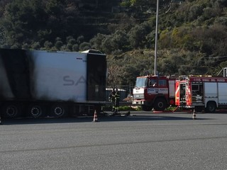 Ventimiglia: camion si incendia in autostrada poco prima della barriera, intervento dei Vigili del Fuoco (Foto)