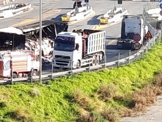 Camion frigo a fuoco, nell’ultima galleria poco prima della barriera autostradale di Ventimiglia e, per fortuna, il conducente riesce a portarlo all’esterno ed a consentire l’intervento dei Vigili del Fuoco.