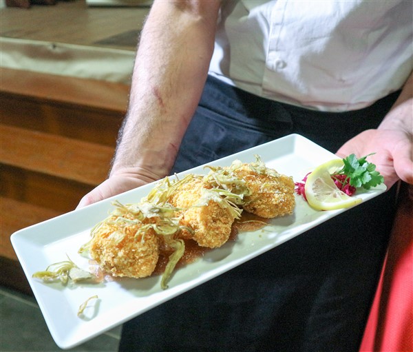 2. Byblos: Gamberi Viola del Golfo ripieni di carciofi nostrani e provola in camicia di chips servitn carciofi croccanti e marmellata di cipolle di Tropea