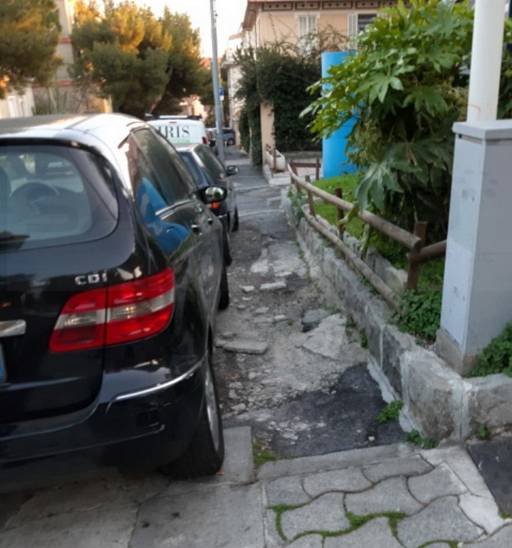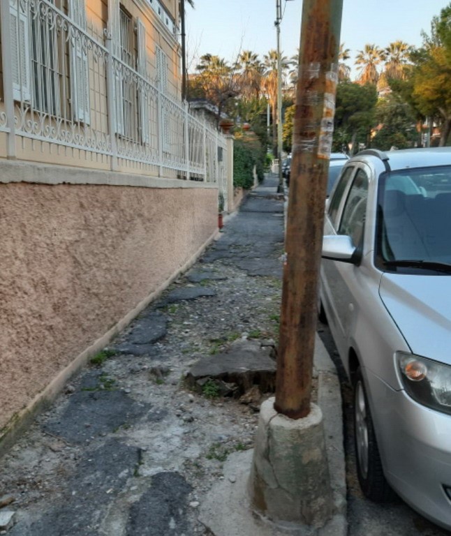 “Ci spiace però constatare purtroppo – proseguono - che via Scoglio e la passeggiata a mare a ridosso della pista ciclabile sono completamente abbandonate. I marciapiedi sono distrutti dai pini che anch’essi sono pericolanti e molto pericolosi, l’asfalto della via è pieno di rattoppi e buche pericolose, una delle quali vicina alla griglia in fondo che ormai è sfondata dal passaggio delle auto, sull’aiuola del parcheggio affianco alla pista ciclabile esiste una pedana in legno non conclusa ed abbandonata da anni, i giardini della passeggiata a mare diventano una enorme pozzanghera quando piove, piena di fango, creata dal passaggio degli automezzi da lavoro che fanno manutenzione agli impianti esistenti della fognatura e del verde, a causa della mareggiata la scogliera è molto compromessa e molti detriti sono presenti lungo la passeggiata, la ringhiera è stata sfondata dalle onde ed è tutta arrugginita, l’illuminazione è inesistente e le panchine sono ormai tutte corrose dal salino”.