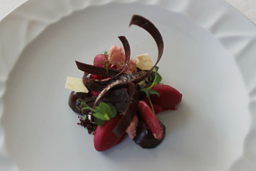 “Zabaione ghiacciato, cioccolato bianco, frutto della passione, accompagnata da mousse al cioccolato nero e fragole, il dessert è una vera formula magica studiata dallo chef per cercare il giusto equilibrio fra dolce e amaro, con l'aggiunta di zafferano di Tiora che esalta il colore tradizione dell'8 marzo”.