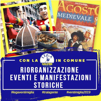 Nel programma elettorale che la Lega di Ventimiglia sta scoprendo in queste settimane non è mancato un occhio di riguardo agli eventi e alle manifestazioni di promozione turistica. L’idea in seno alla squadra politica è quello di effettuare una vera e propria riorganizzazione degli eventi e delle celebrazioni storiche della città.