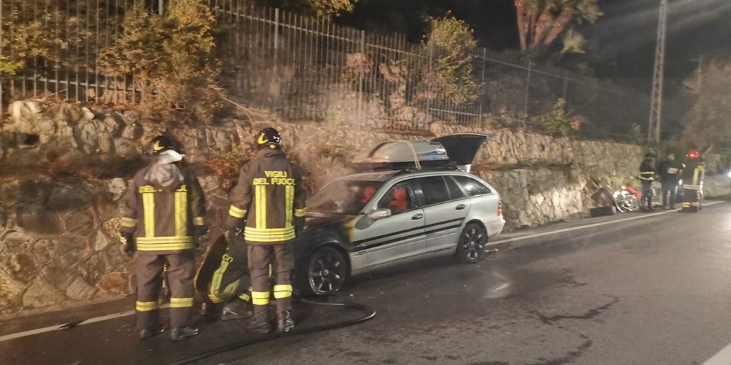 Ospedaletti: auto prende fuoco sull'Aurelia, intervento dei Vigili del Fuoco e strada chiusa per mezz'ora (Foto)