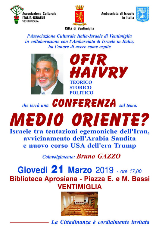 L'Associazione Culturale Italia Israele di Ventimiglia propone una conferenza di eccezionale prestigio in collaborazione con l'Ambasciata di Israele in Italia: “Un nuovo Medio Oriente? Israele tra tentazioni egemoniche dell’Iran, avvicinamento dell’Arabia Saudita e nuovo corso USA dell’era Trump”.