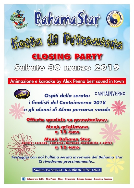 "E' stato un inverno ricco di emozioni e soddisfazioni - ha spiegato Penna - ma anche ricco di appuntamenti come: "Alma percorso vocale" e il "Cantainverno". Per la fine della stagione il Bahama Star saluterà l'inverno con due serate speciali il 23 ed il 30 marzo per accogliere l'arrivo della Primavera. Adesso è tempo di pensare a progetti futuri. Abbiamo in serbo tante sorprese, per la stagione primavera-estate, ma tutto sarà svelato al momento opportuno!".
