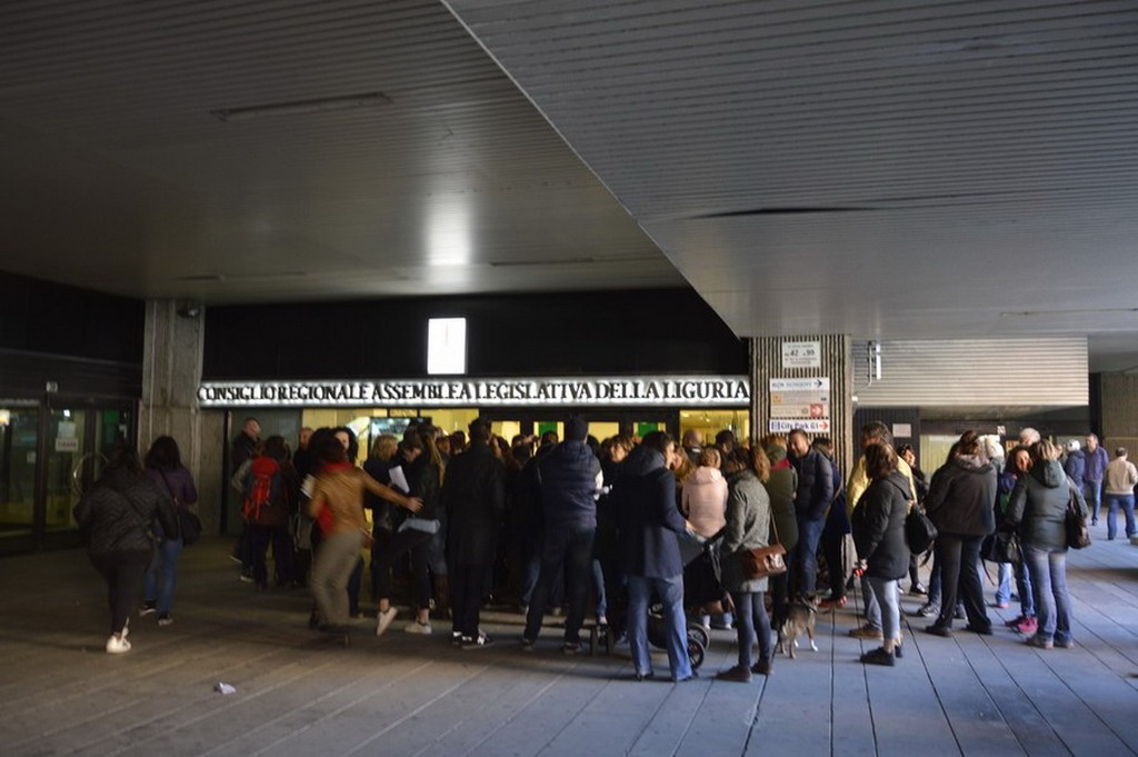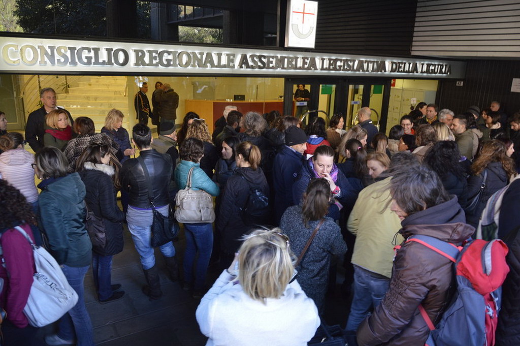 L'assessore regionale Marco Scajola ha deciso di uscire dalla sede del Consiglio per un veloce confronto con i manifestanti che gli hanno rappresentato le proprie istanze, e consegnato della documentazione, con la preghiera di condividerla con l'assessore Viale.