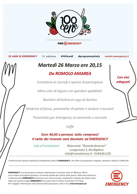 Oltre a mangiare bene, bere bene e sostenere EMERGENCY, la partecipazione alle cene darà anche la possibilità di incontrare lo staff dell’associazione e scoprire da vicino il nostro lavoro.