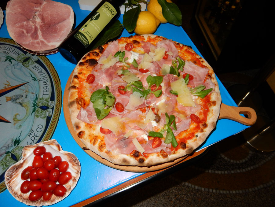 - la pizza "Giulia" che aveva partecipato al Campionato del Mondo del 2016, meritandosi una Menzione Speciale per gli ingredienti a kilometro Zero. Ecco gli ingredienti: Mozzarella Fior di Latte, Salsa di Pomodoro, Pomodorino Datterino, Scaglie di Parmigiano Reggiano "Vacche Rosse" 36 mesi, Favette locali, Stracciata di Burrata, Polpa di Scampi marinata in Olio Extra Vergine di Oliva, Pepe, Limone, Olive Taggiasche.