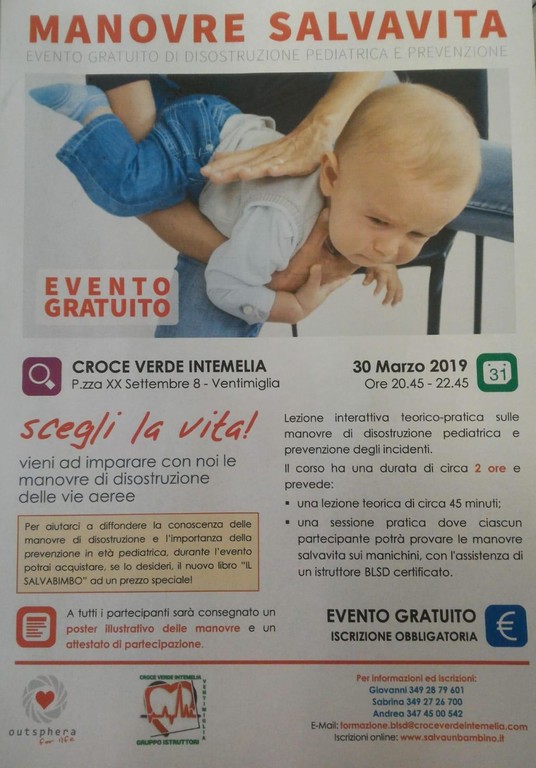 La Croce Verde Intemelia è in prima linea per l’insegnamento delle manovre salvavita. Sabato sera alle 20.45, nella sede di piazza XX Settembre, i volontari della Croce Verde insegneranno le manovre di distruzione pediatrica e la prevenzione. L’evento è gratuito.