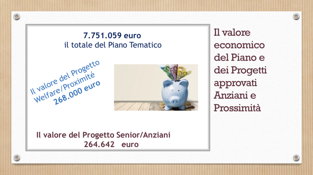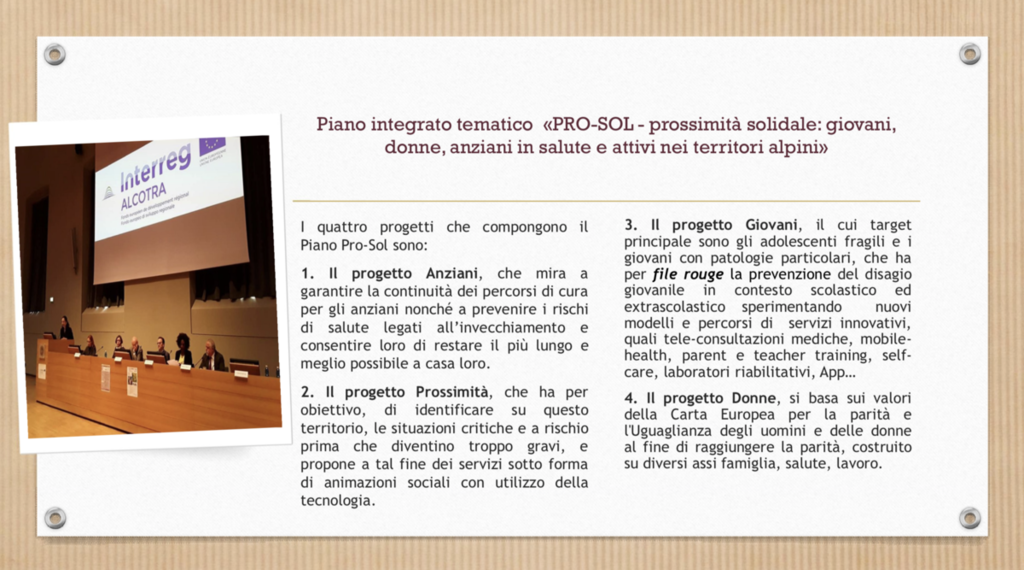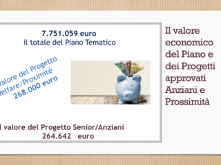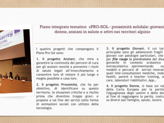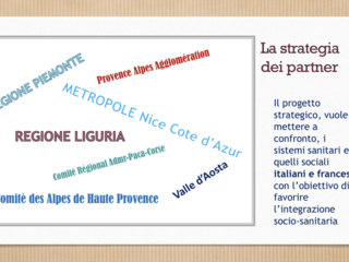 Obiettivo del Piano integrato tematico di prossimità solidale è sviluppare una strategia condivisa tra Italia e Francia, mettendo a confronto i sistemi sanitari e quelli sociali italiani e francesi per favorire l’integrazione socio-sanitaria. I singoli progetti del piano rivolti a anziani, donne, giovani e welfare - proximitè) favoriranno l’introduzione di servizi innovativi rivolti ai cittadini nelle aree transfrontaliere, interne e montane. Il piano è stato approvato con un budget di oltre 7.700.000 euro per una durata complessiva di 4 anni. Tanti i beneficiari coinvolti: per l’Italia la Regione Piemonte in qualità capofila e le Regioni Liguria e Valle d’Aosta in qualità di partner mentre per la Francia, Provence Alpes Agglomération, Metropole Nice Côte d’Azur, Comitè des Alpes de Haute Provence, Comité Régional Admr-Paca-Corse.