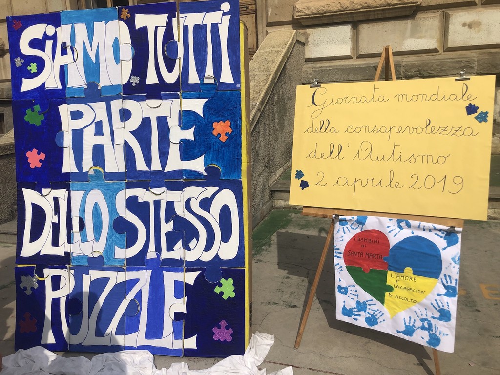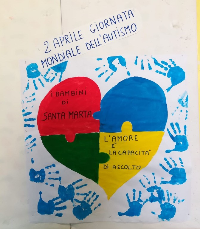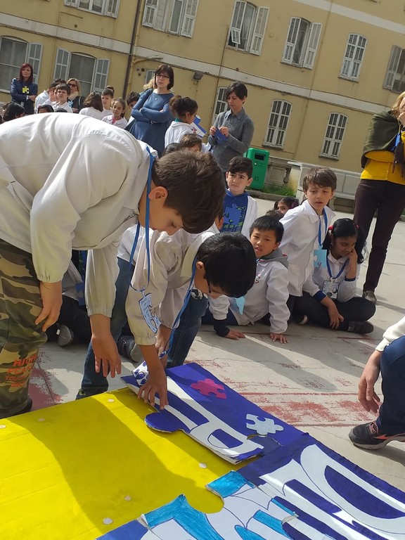 “Abbiamo ascoltato varie storie “Il gattino blu”, “Cippilù lo scoiattolino del pianeta blu”, “Calimero e l’amico speciale”, “L’unicorno triste”, “Martino piccolo lupo”, “Lunetto” e visionato alcuni video come “Mon petit frère de la lune”; ogni classe ha poi dipinto un pezzo del puzzle che abbiamo composto nel cortile della nostra scuola, insieme ai bambini della scuola dell'infanzia Santa Marta. Ognuno di noi è un piccolo Cippilù o Martino o Lunetto l'importante è trovare il modo per comunicare, per giocare e per stare bene insieme” dicono i bimbi della primaria di via Volta.