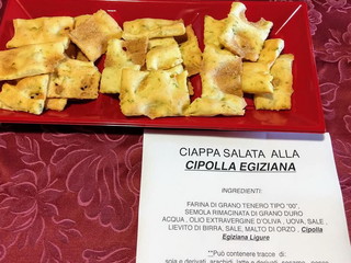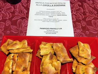 Da un'antica ricetta locale del Panificio F.lli Lia è stata proposta anche la 'Focaccia dolce con Cipolla Egiziana Ligure'. Un dolce della tradizione molto apprezzato che ha incuriosito i partecipanti diventando in maniera quasi del tutto inconsapevole un vero e proprio testimone di cultura alimentare e rurale. Una focaccia gustosa e carica di fantasia, al profumo di arancia e foglie di cipolla egiziana concepita da una società che tanti anni fa era ancora intimamente legata alla terra.
