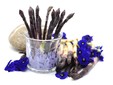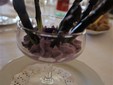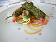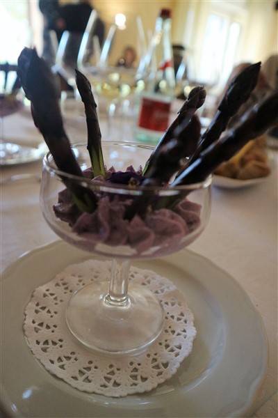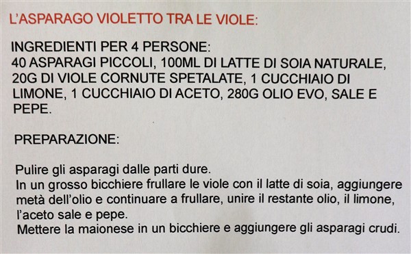 Antipasto: Asparago violetto (presidio Slow Food) tra le viole, dove le viole sono la base di una maionese vegana che accompagna ed esalta il sapore dell’asparago servito a crudo.