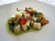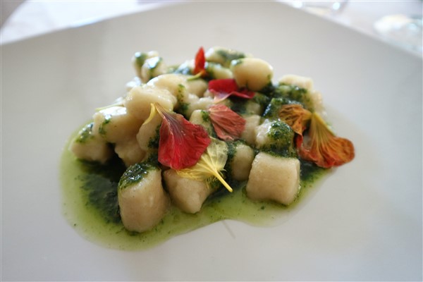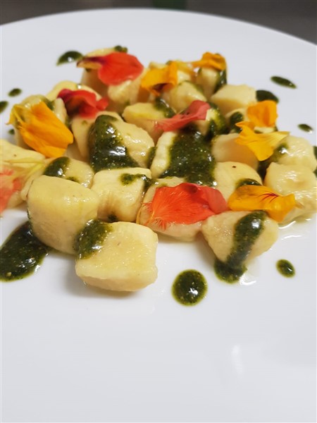 Come primo piatto nel menù sono previsti dei deliziosi gnocchi di patate abbinati ad un pesto di nasturzio e pistacchi, dove il piccante del nasturzio viene domato dal dolce della patata e rilanciato dal gusto inconfondibile del pistacchio. Davvero un piatto degno di lode.