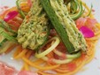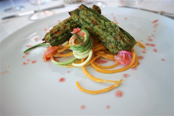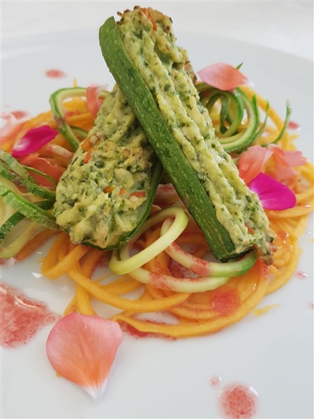 Secondo piatto: zucchine con cuore di calendula, anacardi e geranio serviti su un letto di spaghetti di verdure crude. Le zucchine ripiene sono un classico della cucina ligure ma il ripieno in questo caso è dal sapore unico ed in perfetto equilibrio fra il gusto leggermente speziato della Calendula e il dolce leggermente profumato del geranio.