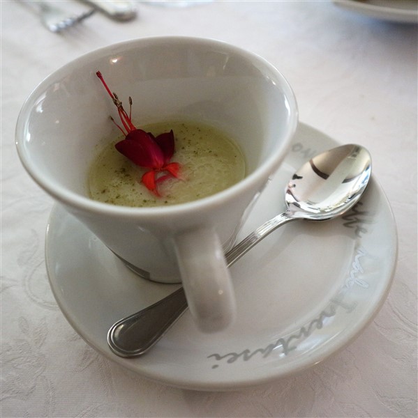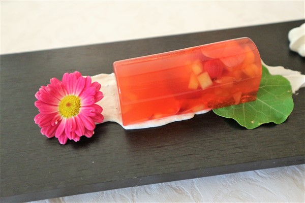 Il dolce porta il nome della stagione, un richiamo alla stagionalità rigorosa della cucina, “Essenza di primavera”, ed è un aspic rosato per l’utilizzo dei petali di rosa e che racchiude come uno scrigno piccoli e croccanti frammenti di frutta e altri petali di fiori. Bello da vedere e buono da mangiare, ideale per chiudere il pasto e godere della vista dei fiori fino alla fine.