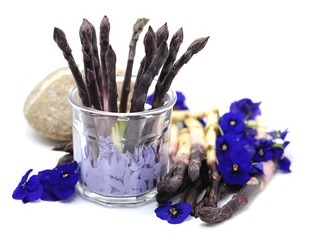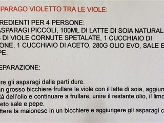 Antipasto: Asparago violetto (presidio Slow Food) tra le viole, dove le viole sono la base di una maionese vegana che accompagna ed esalta il sapore dell’asparago servito a crudo.
