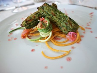 Secondo piatto: zucchine con cuore di calendula, anacardi e geranio serviti su un letto di spaghetti di verdure crude. Le zucchine ripiene sono un classico della cucina ligure ma il ripieno in questo caso è dal sapore unico ed in perfetto equilibrio fra il gusto leggermente speziato della Calendula e il dolce leggermente profumato del geranio.