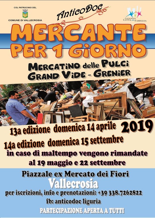 Domenica 14 aprile si terrà a Vallecrosia la tredicesima edizione del Mercatino delle pulci ‘Mercante per un Giorno’, sullo stile dei Vide-Grenier francesi, gli ‘svuota cantine’...si svolgerà nel Piazzale dell’ex Mercato dei Fiori organizzato dall’Associazione Anticodoc di Vallecrosia, con il patrocinio del Comune di Vallecrosia. Nel caso di condizioni meteo avverse la manifestazione sarà svolta domenica 19 maggio.