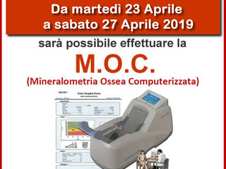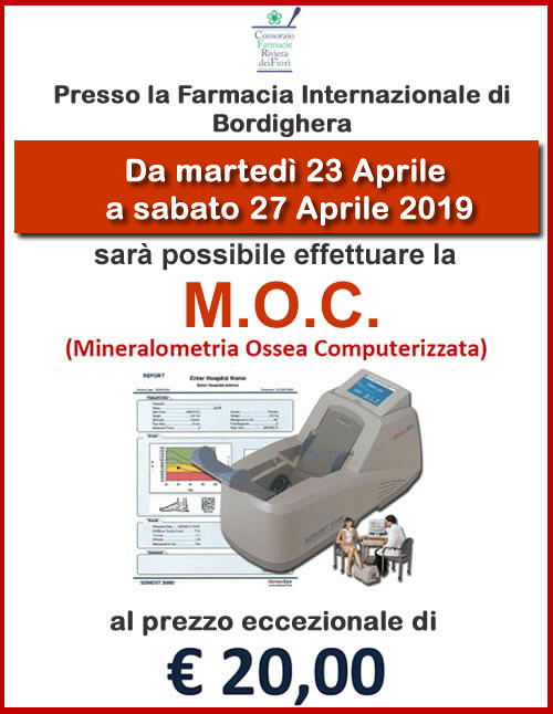 Da oggi 23 aprile a sabato 27 aprile, presso la Farmacia Internazionale di Bordighera sarà possibile effettuare la M.O.C. (Mineralometria Ossea Computerizzata). Si tratta di un test diagnostico che permette di misurare i livelli di calcio e altri minerali, nelle ossa dello scheletro umano. La MOC è indicata principalmente per la diagnosi di osteopenia od osteoporosi. L'esame viene eccezionalmente proposto alla clientela al costo di soli euro 20.
