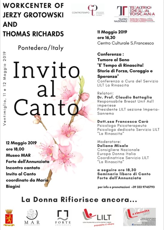 Sabato 11 e domenica 12 maggio il Workcenter di Jerzy Grotowski e Thomas Richards, conosciuto in tutto il mondo non solo teatrale, arriva a Ventimiglia grazie alla LlLT e all’Associazione Controtempo con un Seminario libero di canto (oratorio di San Francesco, sabato 11) e un Incontro Cantato ( Forte dell’Annunziata, domenica 12 – per info e prenotazioni 333.97.45.793, con intero ricavato a favore del Servizio LILT “La Rinascita”).
