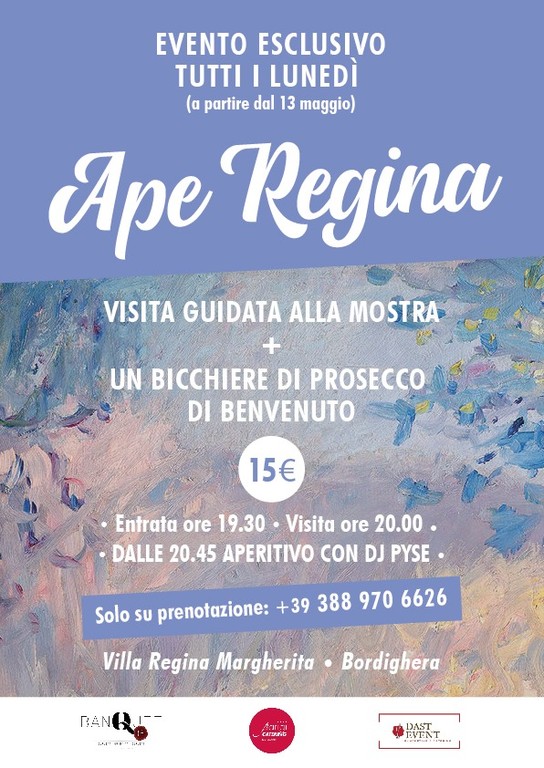 Lunedì 20 maggio, in occasione della mostra “Claude Monet, ritorno in Riviera”, apertura straordinaria della residenza della Regina Margherita a Bordighera. Sarà possibile effettuare una visita guidata personalizzata a partire dalle 19.30 entro le ore 20 alle opere di Monet e di altri artisti minori. All'entrata verrà offerto ai partecipanti un calice di prosecco di benvenuto e dopo la visita guidata ci sarà un aperitivo in giardino con in sottofondo la musica di Dj Pyse.