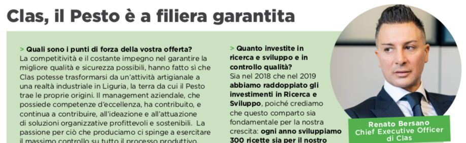 Da oltre 15 anni la Clas, azienda ligure guidata da Renato Bersano come Amministratore Delegato e Massimo Bianchi come Direttore Generale, è presente sul mercato mondiale della produzione di pesti a marchio privato grazie alla “competitività e il costante impegno nel garantire la migliore qualità e sicurezza possibili, trasformandosi da un’attività artigianale a una realtà industriale in Liguria, la terra da cui il Pesto trae le proprie origini” come scrive in un recente articolo la rivista internazionale Food.