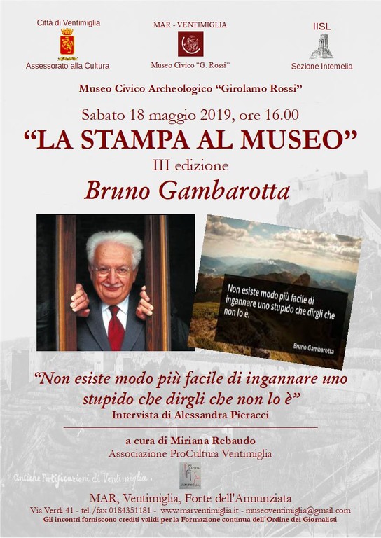 “Non esiste modo più facile di ingannare uno stupido che dirgli che non lo è”. E' una delle frasi celebri (raccolte nel volume omonimo) di Bruno Gambarotta, scrittore, giornalista, conduttore (nonché autore) televisivo e radiofonico, oltre che attore e dirigente Rai. Un genio poliedrico, virante verso l'umorismo a partire dalla stessa autodefinizione di “scrittore artigiano”. Bruno Gambarotta sabato 18 maggio alle 16 chiuderà al Forte dell'Annunziata la terza edizione del ciclo di incontri de “La Stampa al Museo”, organizzato da Miriana Rebaudo con l'Associazione Pro Cultura Ventimiglia. Ad intervistarlo sarà la giornalista Alessandra Pieracci. Ospite giovedì 9 maggio al Salone del Libro di Torino con il suo omaggio a Joseph Roth, lo scrittore-giornalista piemontese parlerà di comunicazione, informazione e fiction tv, perché il “nostro” è anche attore di fiction (il commissario Manara, giusto per citarne uno).