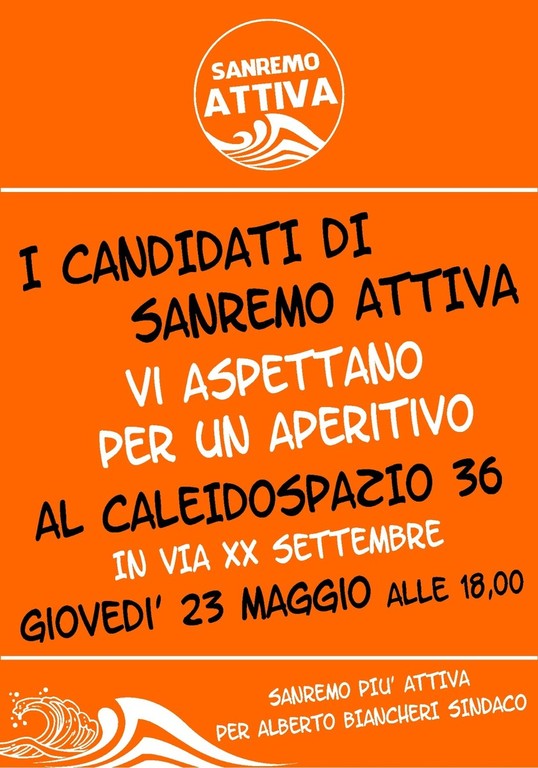 Questa sera, a partire dalle 18.30, il movimento civico “Sanremo Attiva” a sostegno del candidato sindaco Alberto Biancheri organizza una bicchierata di fine campagna elettorale presso il Caleidospazio Trentasei in via XX Settembre.