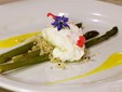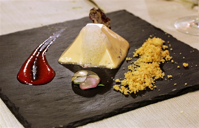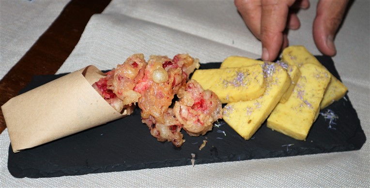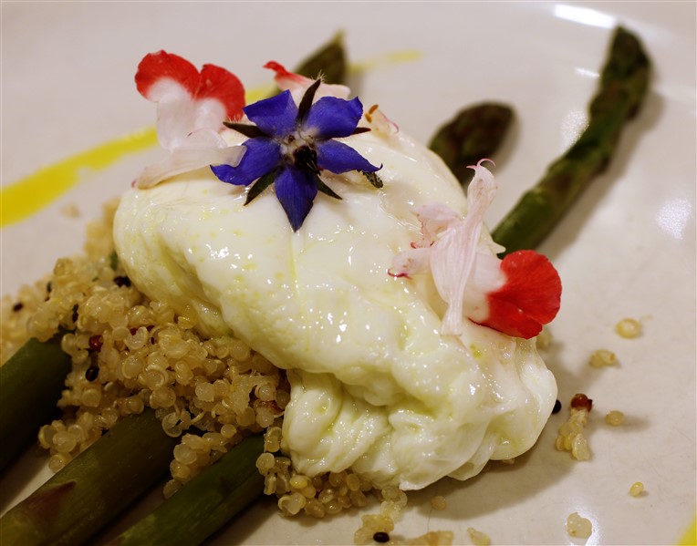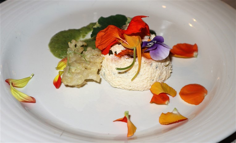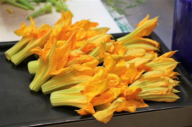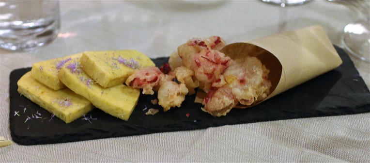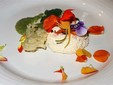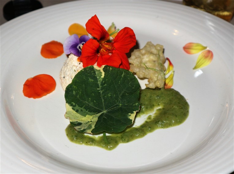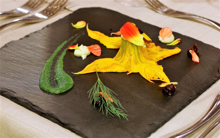 I fiori di zucca, spesso erroneamente considerati un ortaggio, hanno dato il via al menù in una preparazione dal titolo intrigante “I fiori nel fiore”, un florilegio di corolle, petali e germogli, coloratissimo e delizioso.