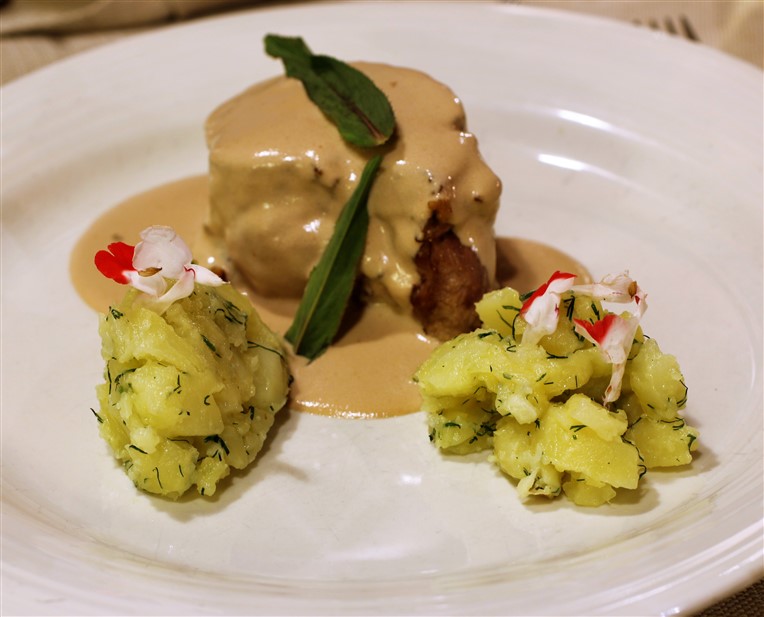 Filetto di Maialino al Dragoncello, Insalata di Patate Novelle, Aneto e Fiori di Salvia