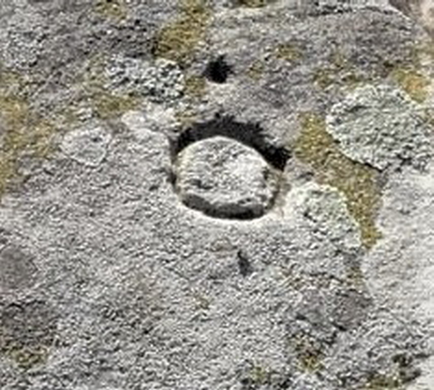 La cima di monte Caggio dove la sacralità della montagna mai sopita attraverso i millenni è documentata dalla presenza di un altare sacrificale indicato dalla freccia, l'incisione di un cerchio solare, 2 cruciformi di cristianizzazione, una croce e una statua della Madonna.