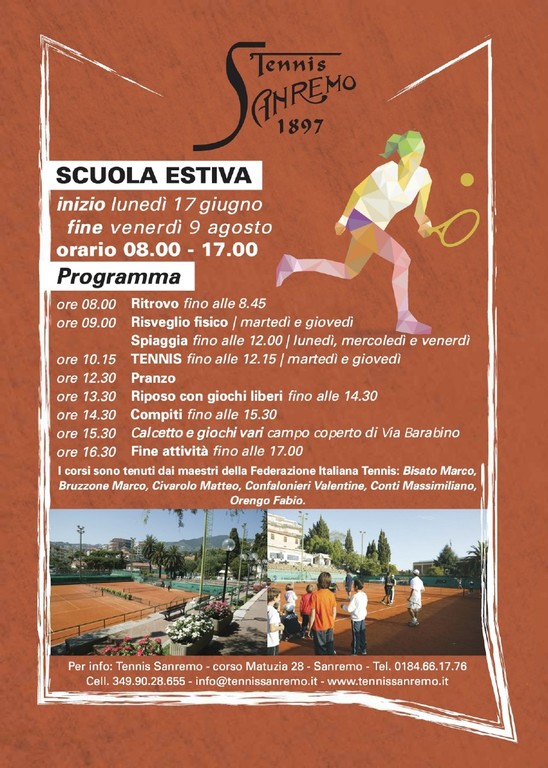 Ormai la chiusura delle scuole è imminente e le vacanze sono dietro l'angolo. Dopo un anno di impegni scolastici, i più giovani hanno bisogno di riposarsi, divertirsi, fare qualche compito e magari trascorrere un'estate all'insegna dello sport. Avete già pensato a qualche progetto estivo per i vostri figli? Al Tennis Sanremo di Corso Matuzia 28 è già possibile iscriversi alla scuola estiva, un'iniziativa che da diversi anni unisce ragazzi e ragazze fino ai 16 anni nonché naturale prosecuzione della prestigiosa Scuola Addestramento Tennis riconosciuta dalla Federazione Italiana Tennis.