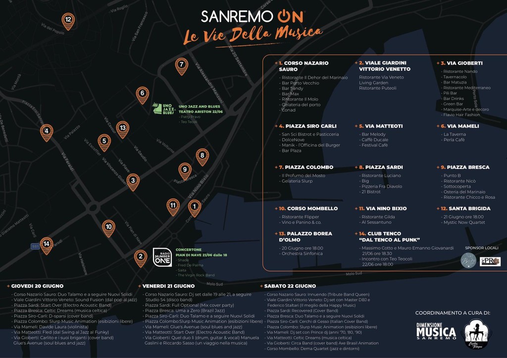 Giovedì 20 si parte con l'inaugurazione simbolica alle 18 in via Matteotti con il duo di archi dell'Orchestra Sinfonica di Sanremo. Alle 21 irromperanno in scena le piazze e le vie cittadine con i locali pubblici e le varie band che si esibiranno. Hanno già aderito piazza Bresca, piazza Sardi, piazza Siro Carli, piazza Colombo, piazza Borea D'Olmo oltre alla zona di porto vecchio, via XX Settembre e via Gioberti.